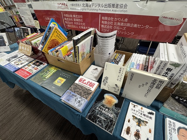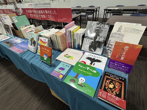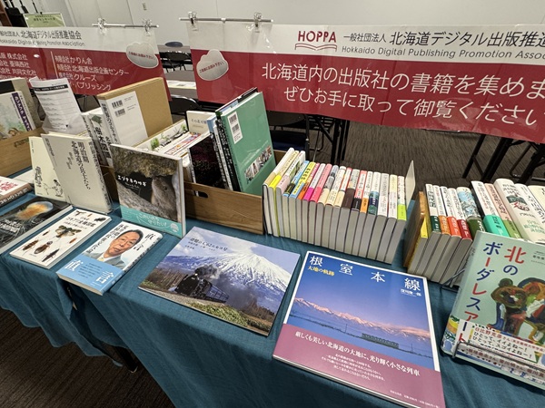 今回は当協会加盟出版社様8社にご協力いただき展示しました。北海道の歴史・アイヌ文化・自然等、様々なジャンルの書籍合計156冊の展示を行い、来場者の方々に道内出版物の存在をアピールしました。地域資料としても価値のある書籍がたくさんありますので、来場者の方々からも好評をいただきました。